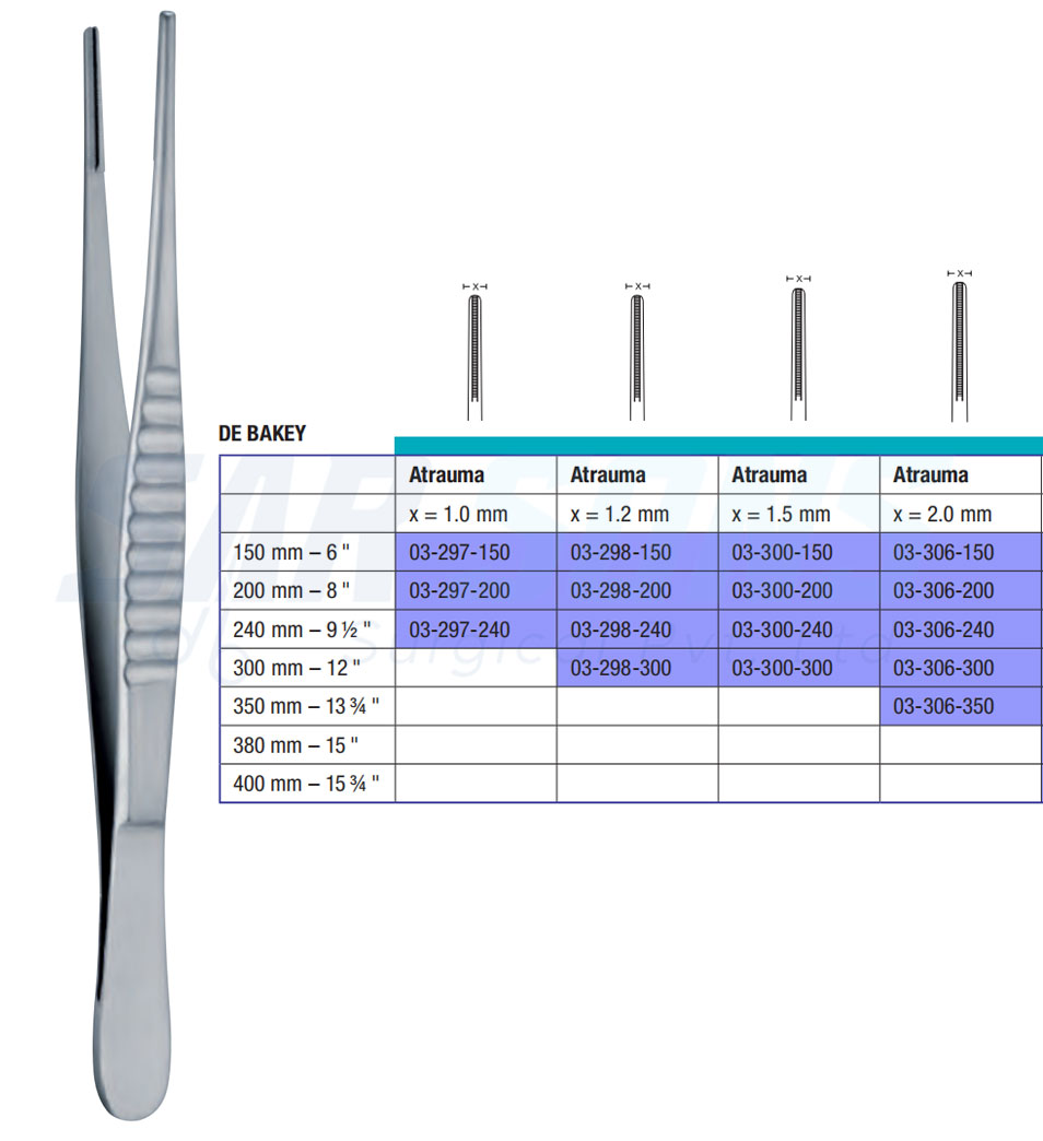 150 mm – 6 " 03-298-150 De Bakey Atraumatic Tissue Forceps ( x = 1.2 mm )